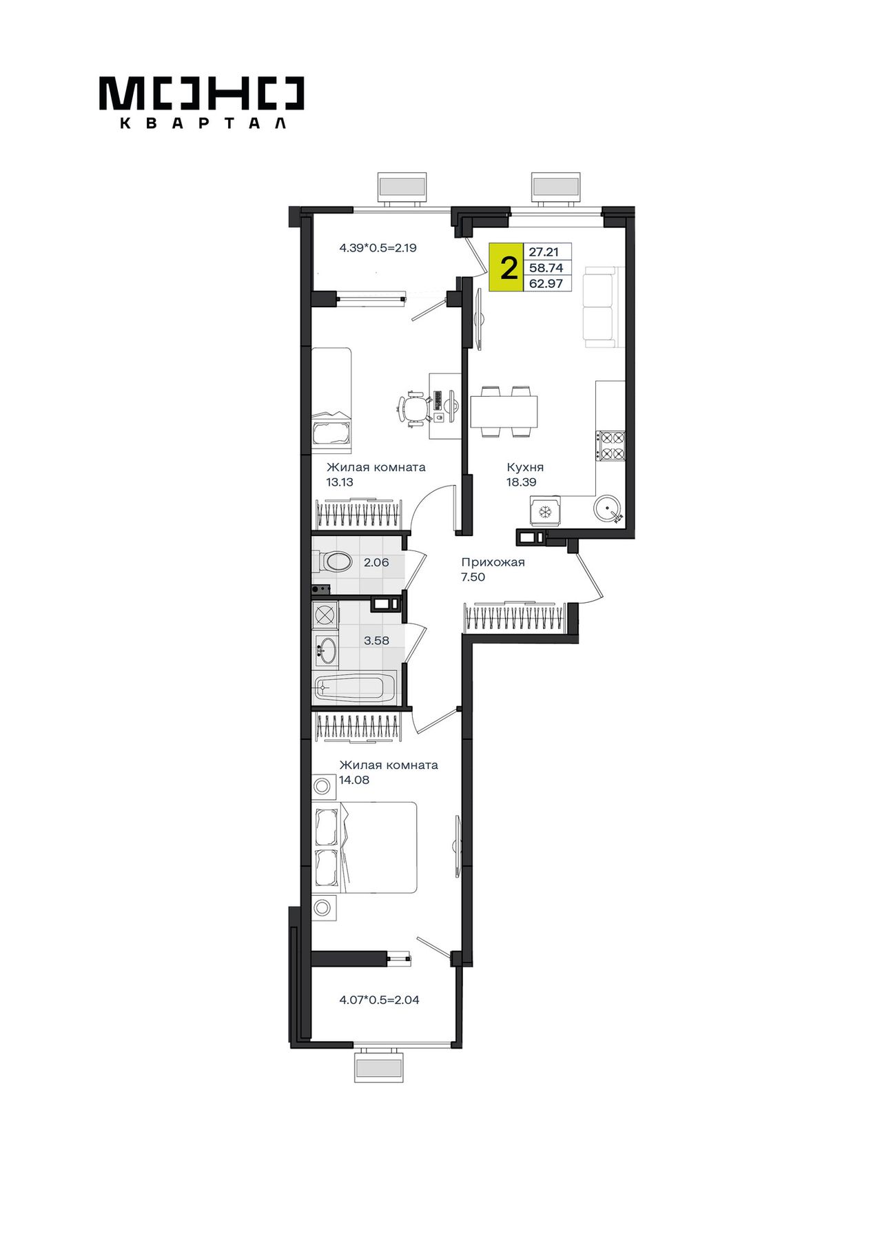 2-комнатная — 62,97 м² 5/8 эт. в МОНО Квартал
