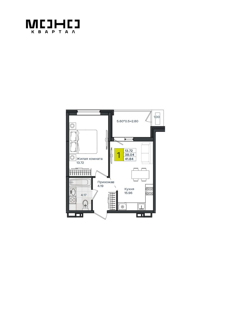 1-комнатная — 41,84 м² 3/8 эт. в МОНО Квартал