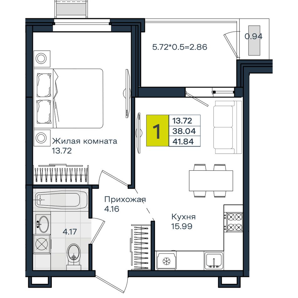 1-комнатная — 41,84 м² 2/8 эт. в МОНО Квартал