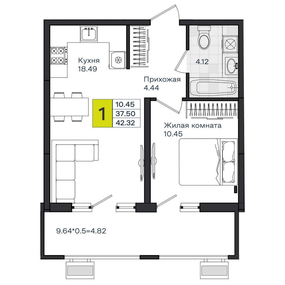 1-комнатная — 42,32 м² 2/8 эт. в МОНО Квартал