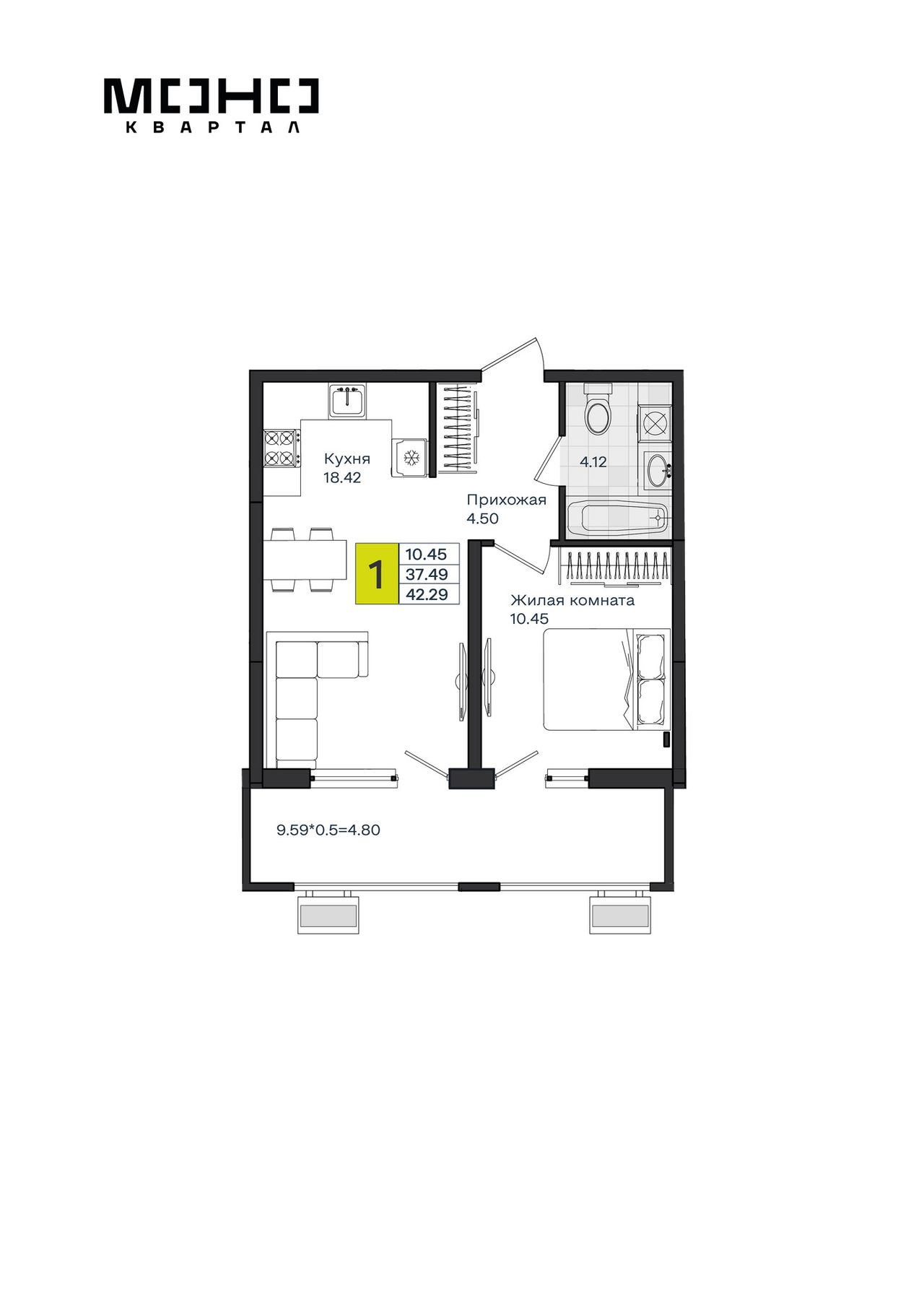 1-комнатная — 42,29 м² 2/8 эт. в МОНО Квартал
