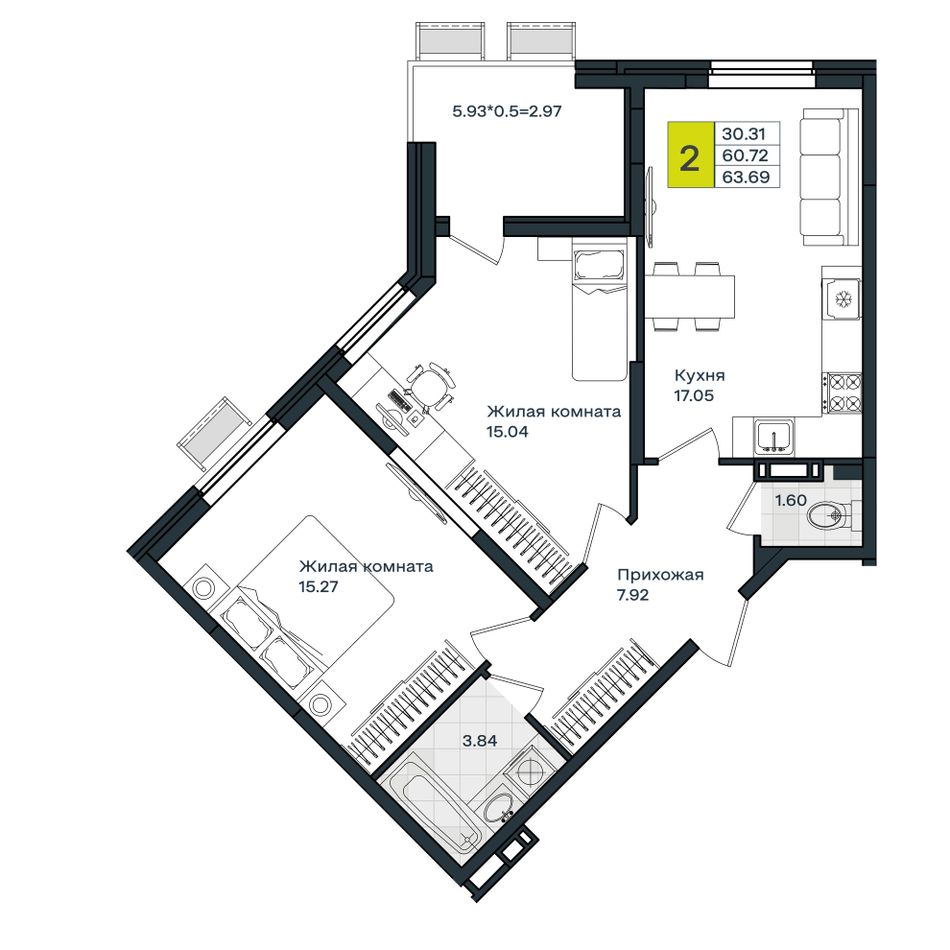 2-комнатная — 63,69 м² 8/8 эт. в МОНО Квартал