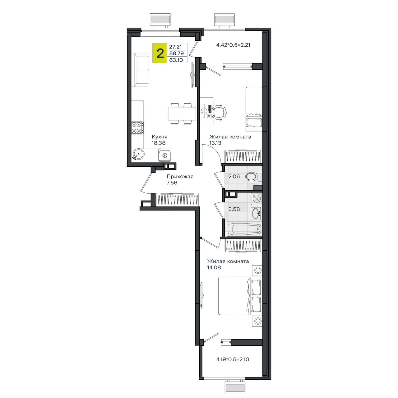 2-комнатная — 63,1 м² 8/8 эт. в МОНО Квартал