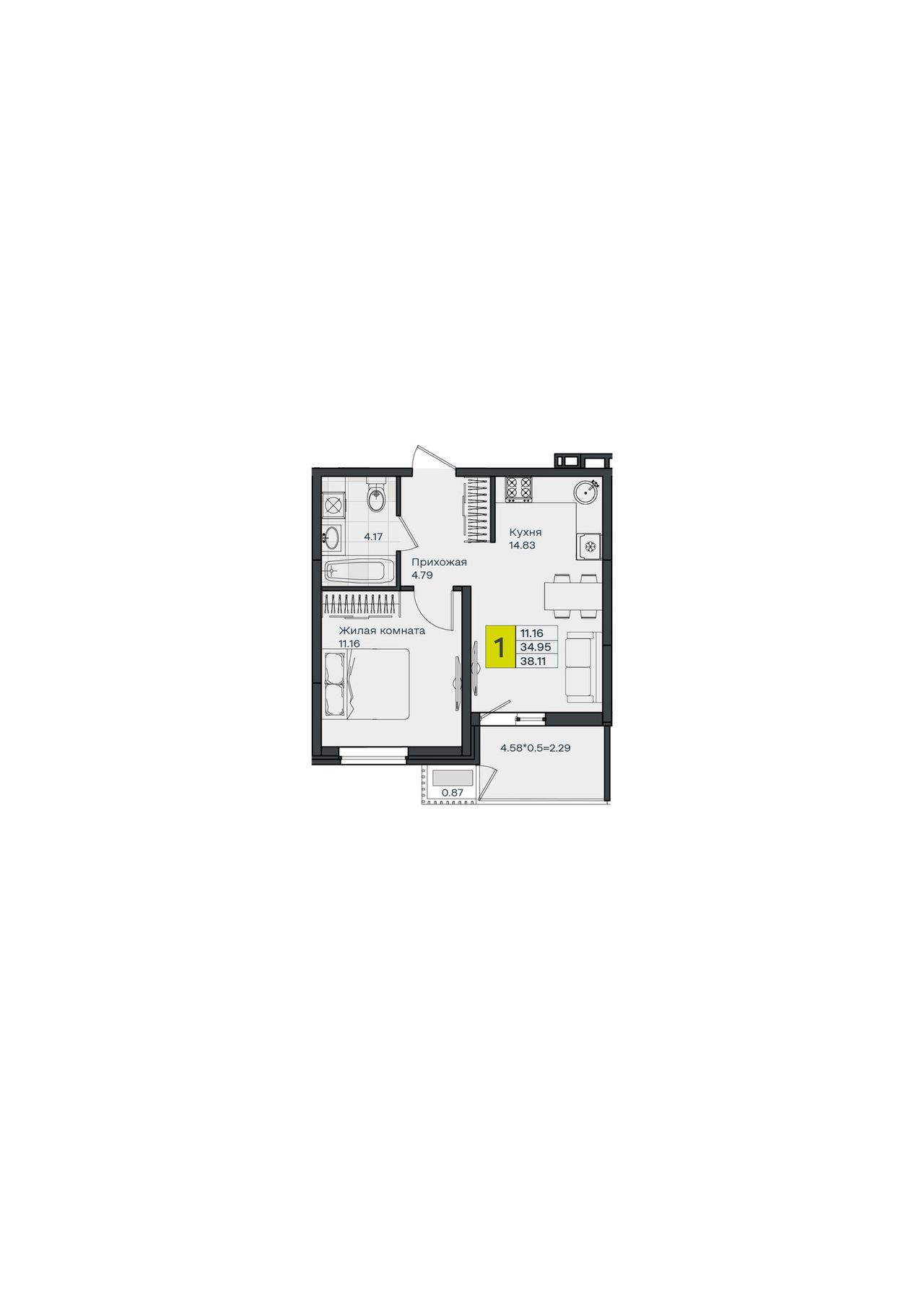1-комнатная — 38,11 м² 8/8 эт. в МОНО Квартал