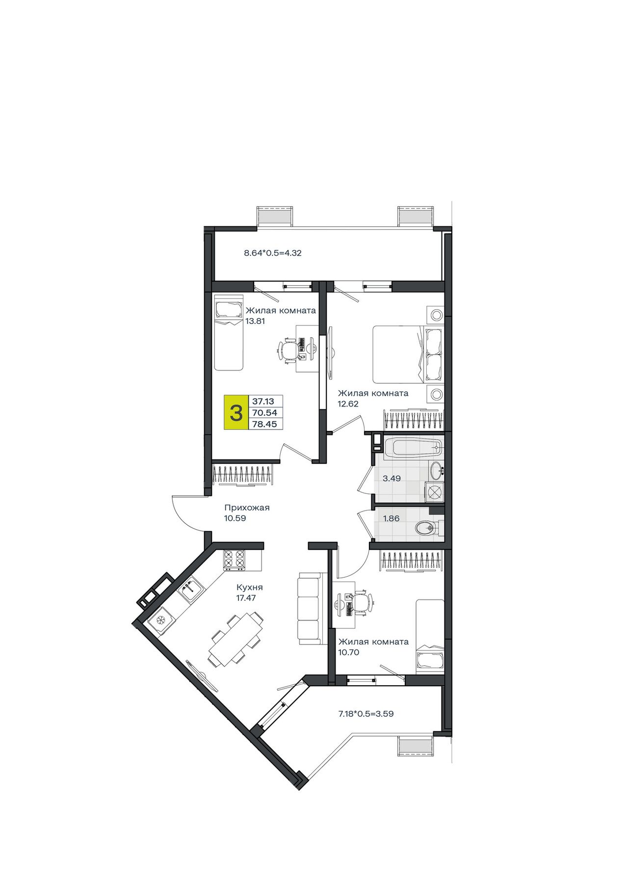 3-комнатная — 78,45 м² 5/8 эт. в МОНО Квартал