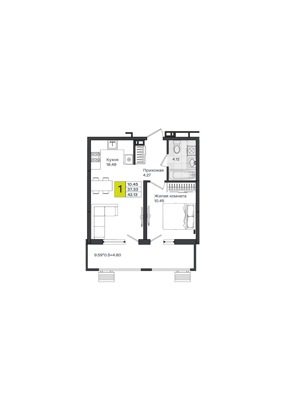 1-комнатная — 42,13 м² 5/8 эт. в МОНО Квартал