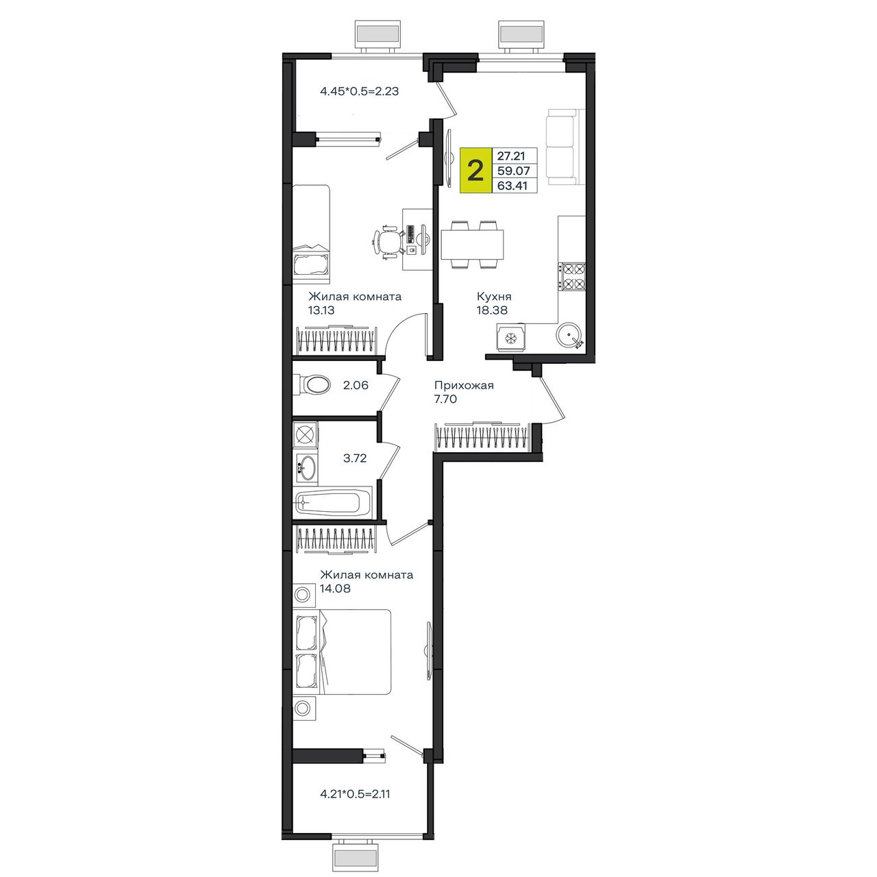 2-комнатная — 63,41 м² 2/8 эт. в МОНО Квартал