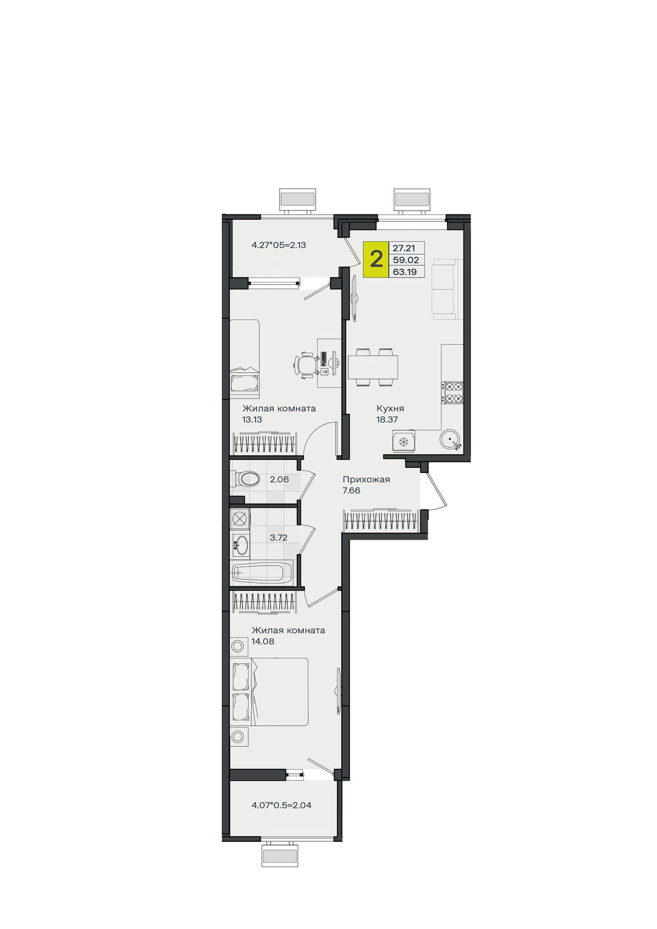 2-комнатная — 63,19 м² 2/8 эт. в МОНО Квартал