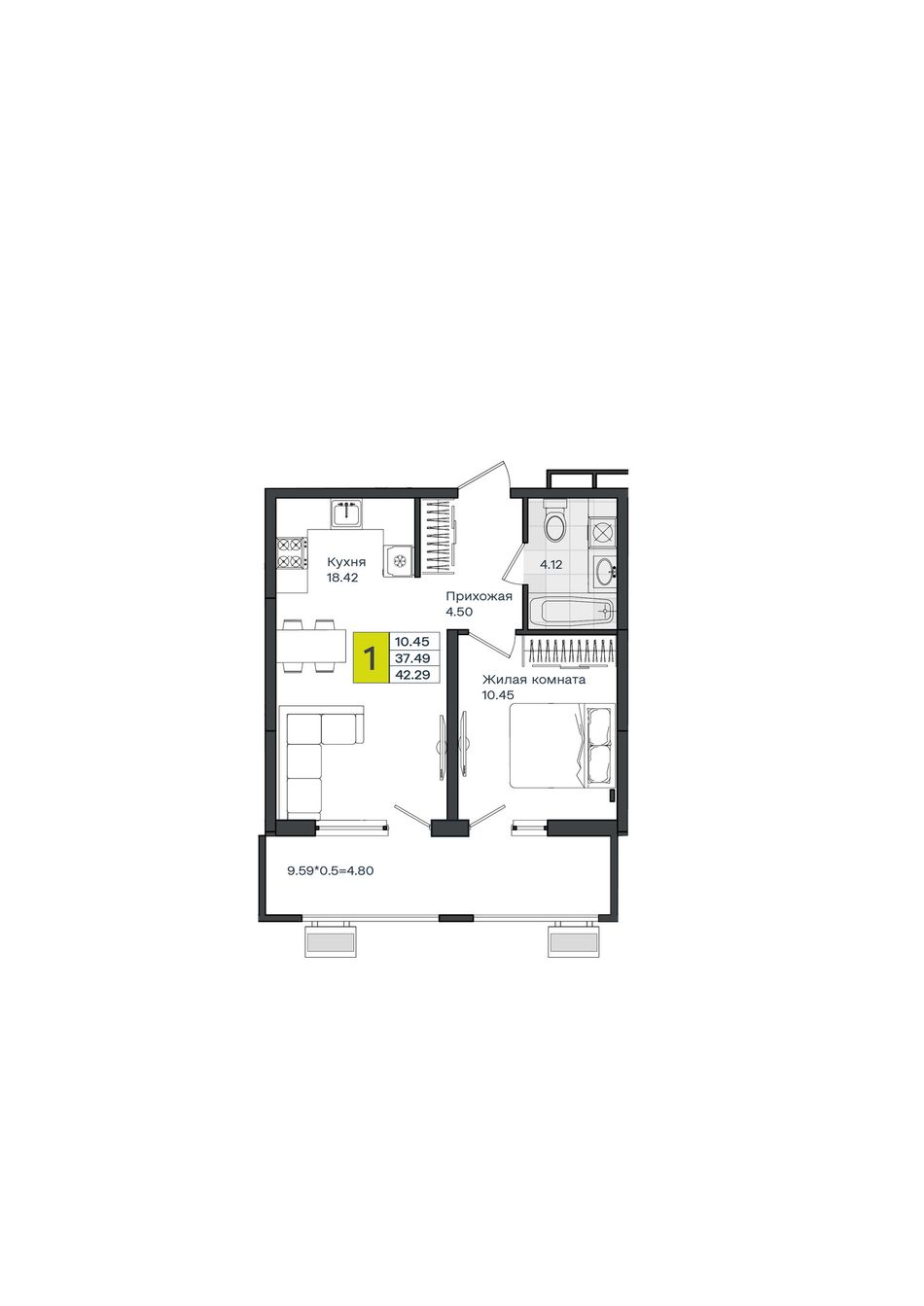 Общая площадь42,29 м²