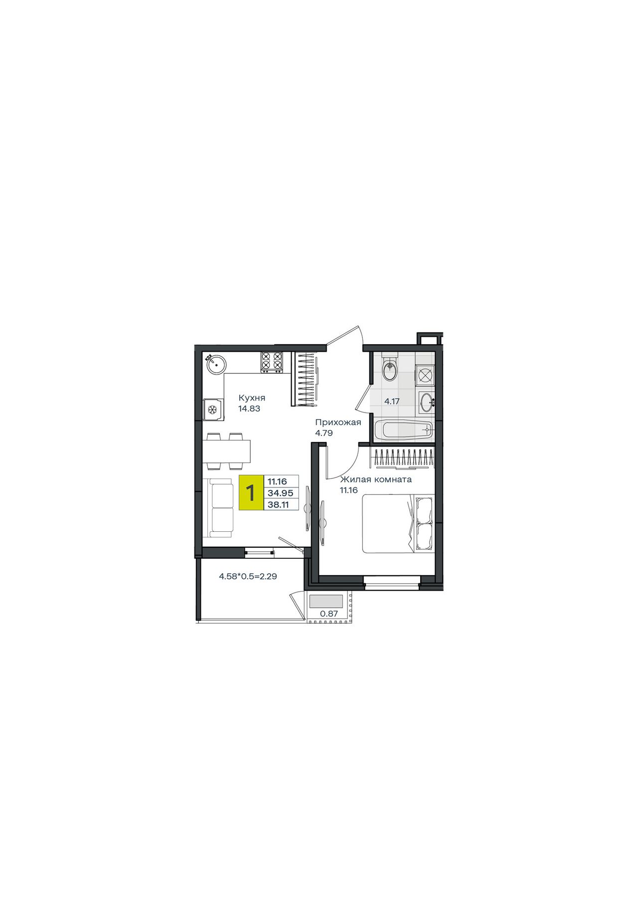 1-комнатная — 38,11 м² 2/8 эт. в МОНО Квартал