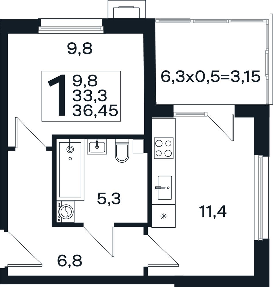 1-комнатная — 36,45 м² 1/4 эт. в Новая Елизаветка