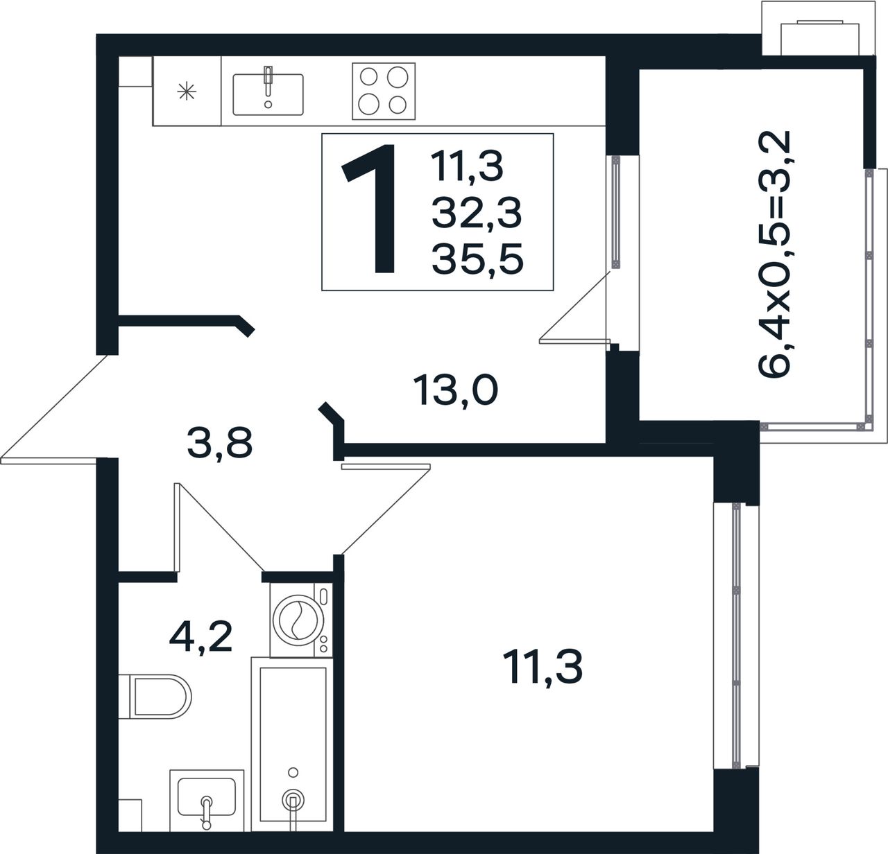 1-комнатная — 35,5 м² 1/4 эт. в Новая Елизаветка