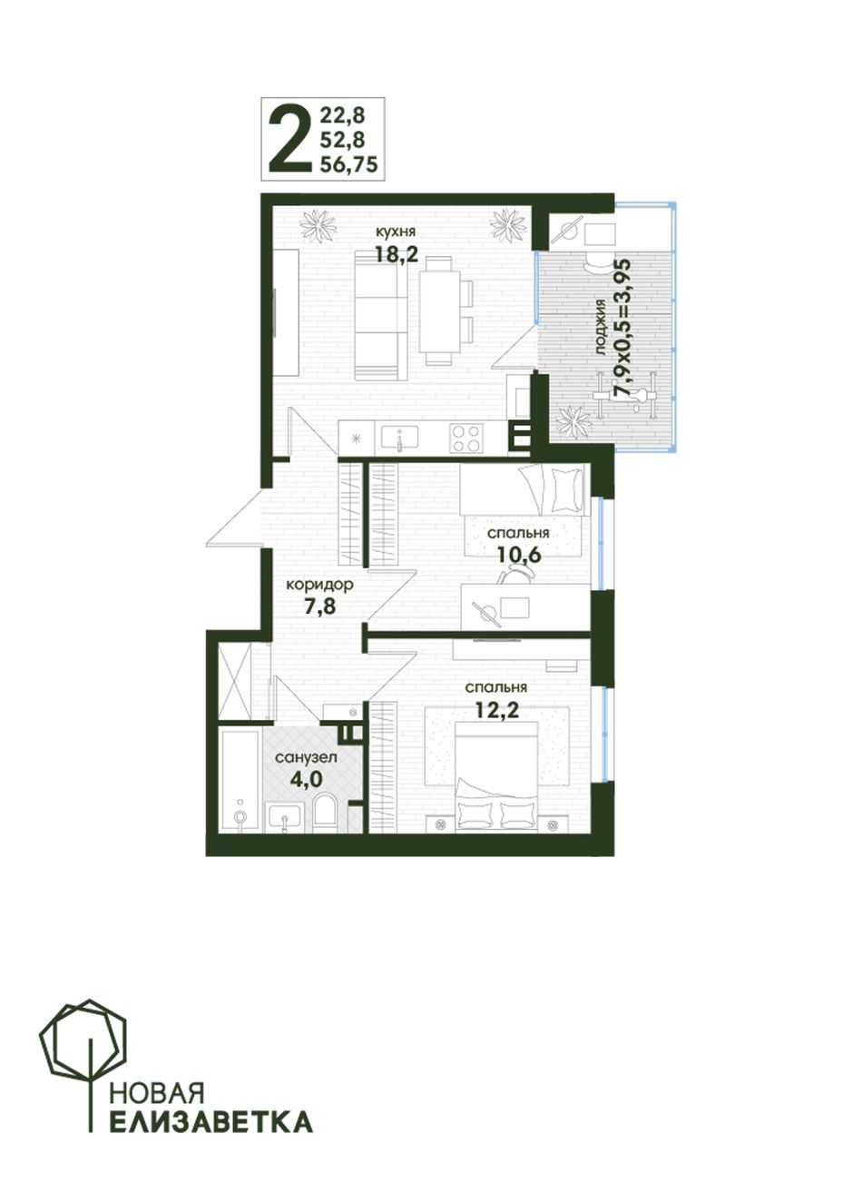 2-комнатная — 56,75 м² 4/4 эт. в Новая Елизаветка