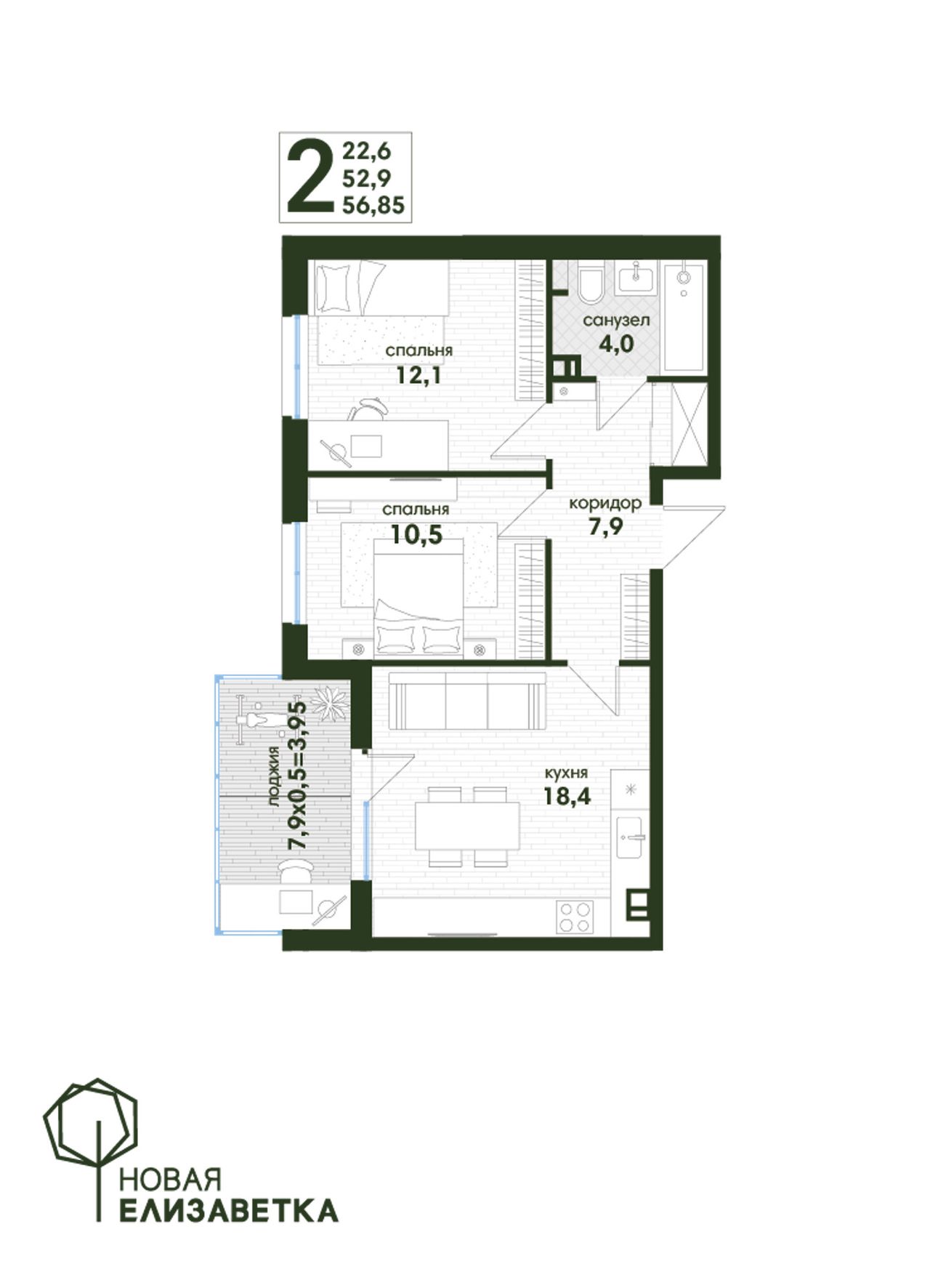 2-комнатная — 56,85 м² 4/4 эт. в Новая Елизаветка
