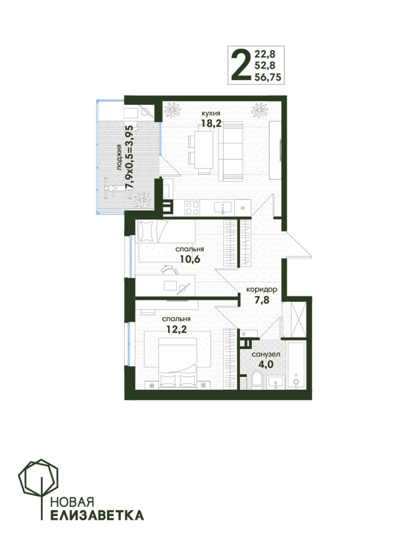 2-комнатная — 56,75 м² 4/4 эт. в Новая Елизаветка