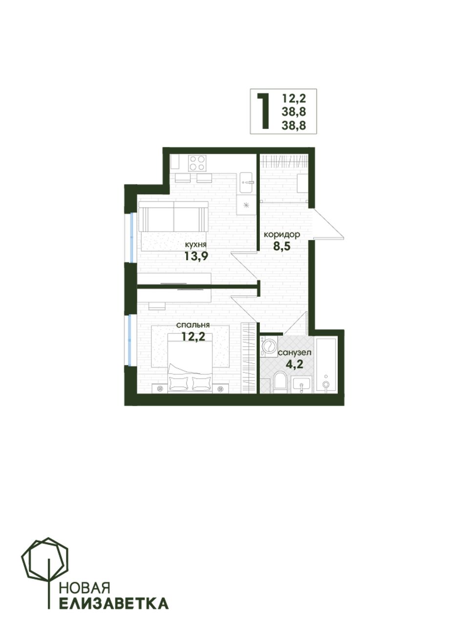 1-комнатная — 38,8 м² 1/4 эт. в Новая Елизаветка