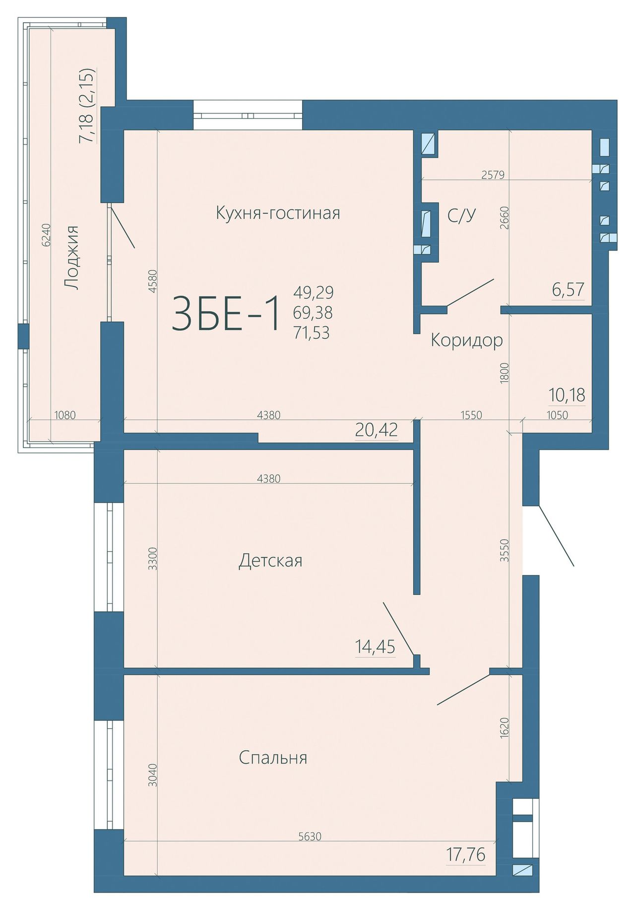 2-комнатная — 71,26 м² 15/15 эт. в Наследие