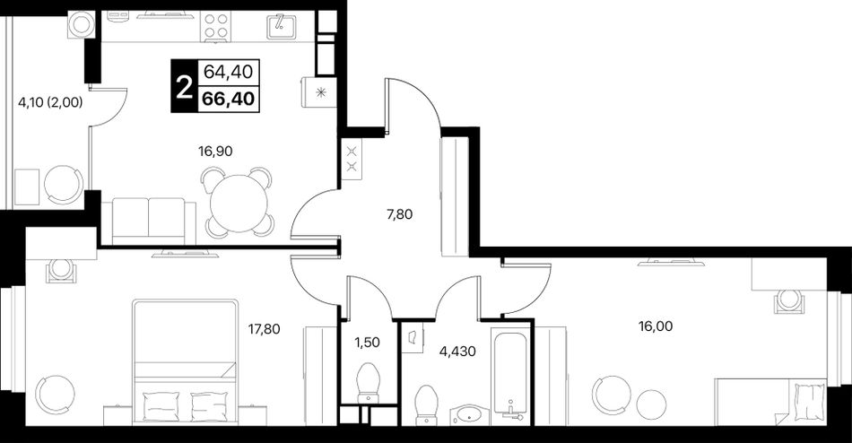 2-комнатная — 66,4 м² 9/20 эт. в Квартал впечатлений Эстет