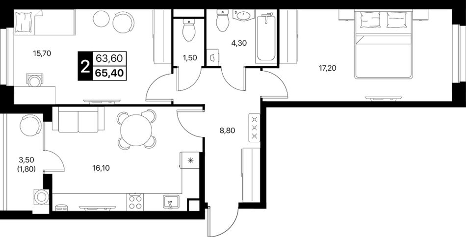 2-комнатная — 65,4 м² 2/20 эт. в Квартал впечатлений Эстет
