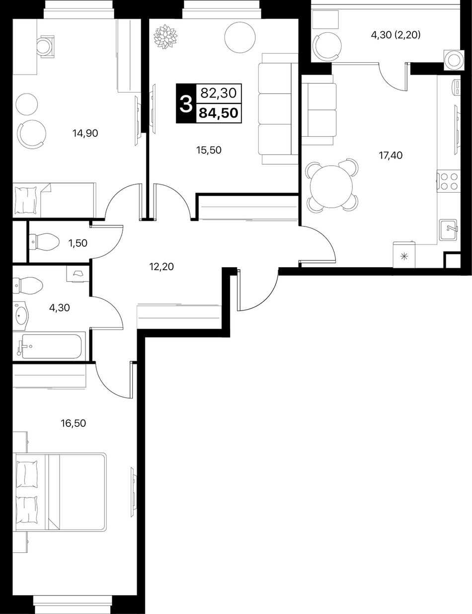 3-комнатная — 84,5 м² 2/20 эт. в Квартал впечатлений Эстет