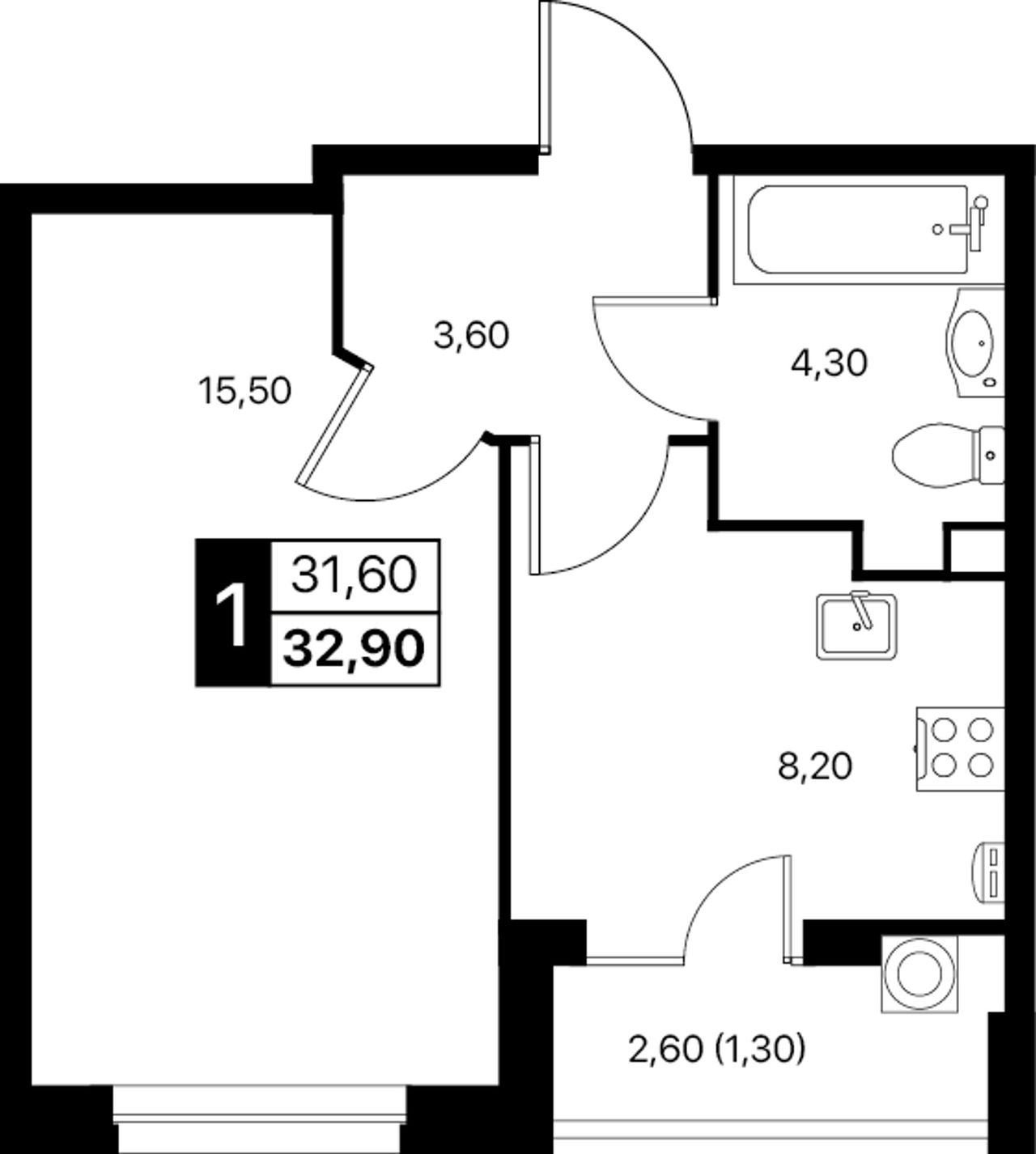 1-комнатная — 32,9 м² 2/20 эт. в Квартал впечатлений Эстет