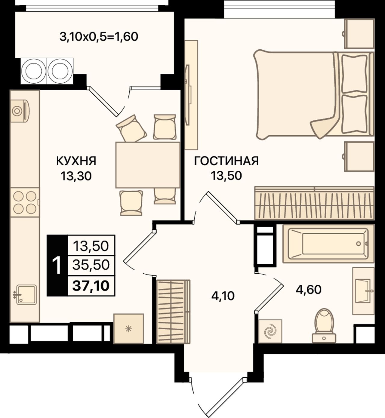 1-комнатная — 37,1 м² 16/18 эт. в Движение61