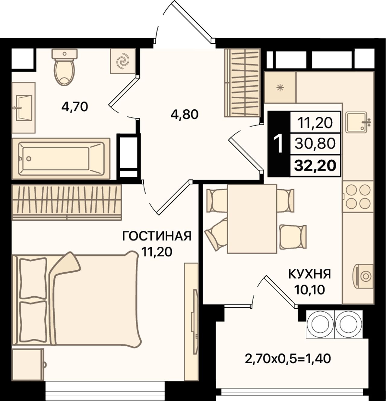 | 1-комн. | 32 - 43 м² | 4,8 - 6,5 млн ₽ |