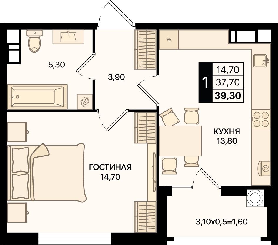 Общая площадь39,3 м²