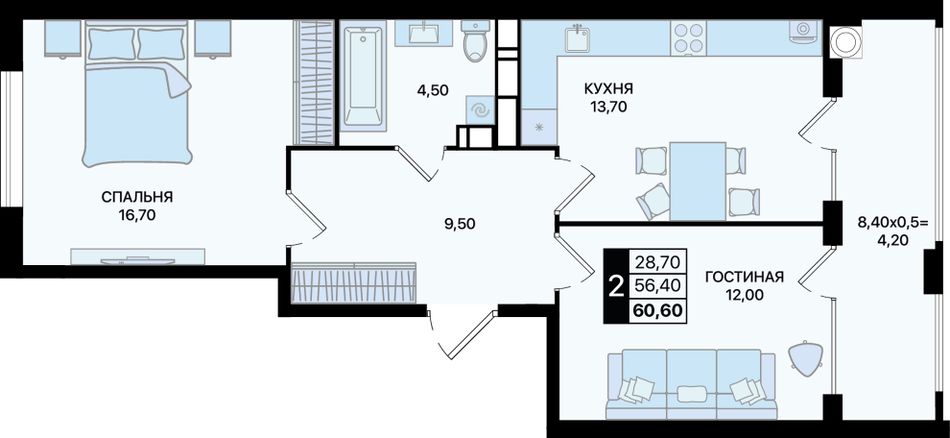 2-комнатная — 60,6 м² 9/15 эт. в Движение61