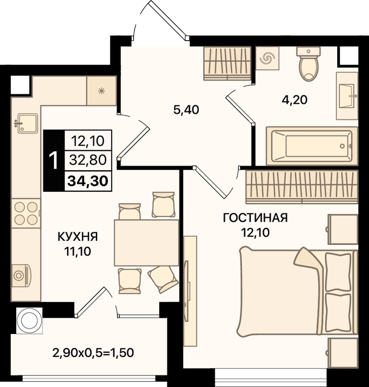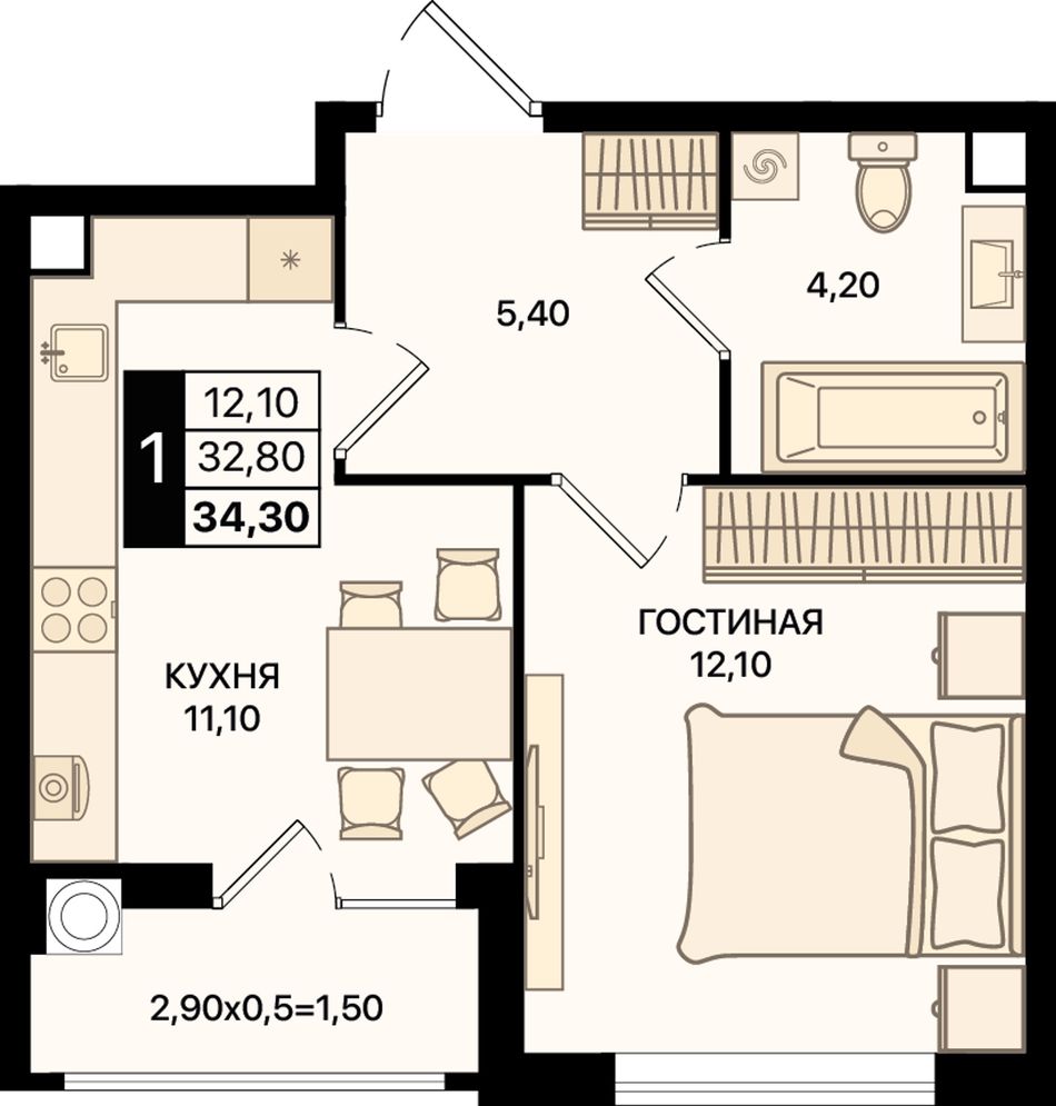 1-комнатная — 34,3 м² 2/15 эт. в Движение61