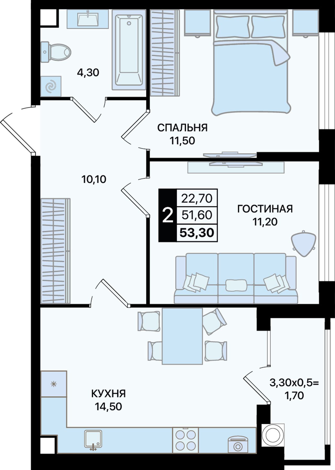 2-комнатная — 53,3 м² 1/15 эт. в Движение61