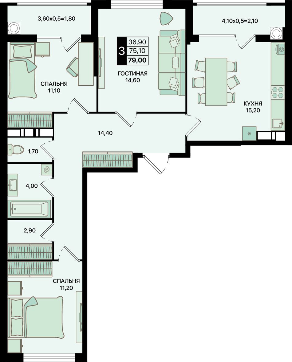3-комнатная — 79 м² 3/15 эт. в Движение61