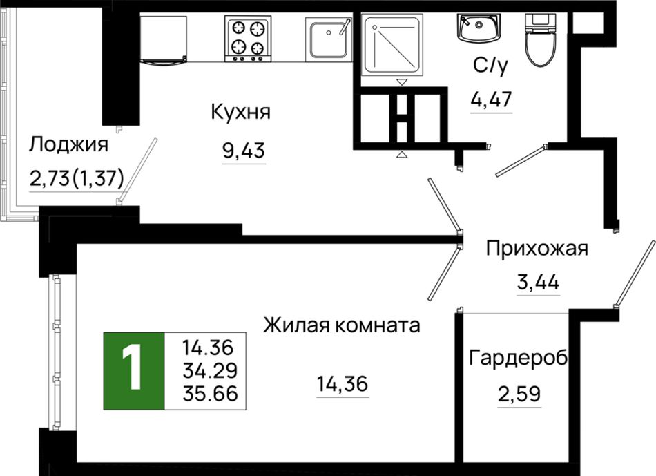 1-комнатная — 35,66 м² 7/25 эт. в Октябрь Парк