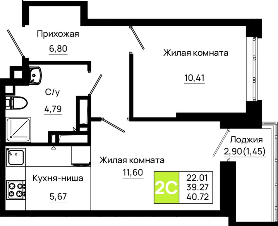 1-комнатная — 40,72 м² 18/25 эт. в Октябрь Парк