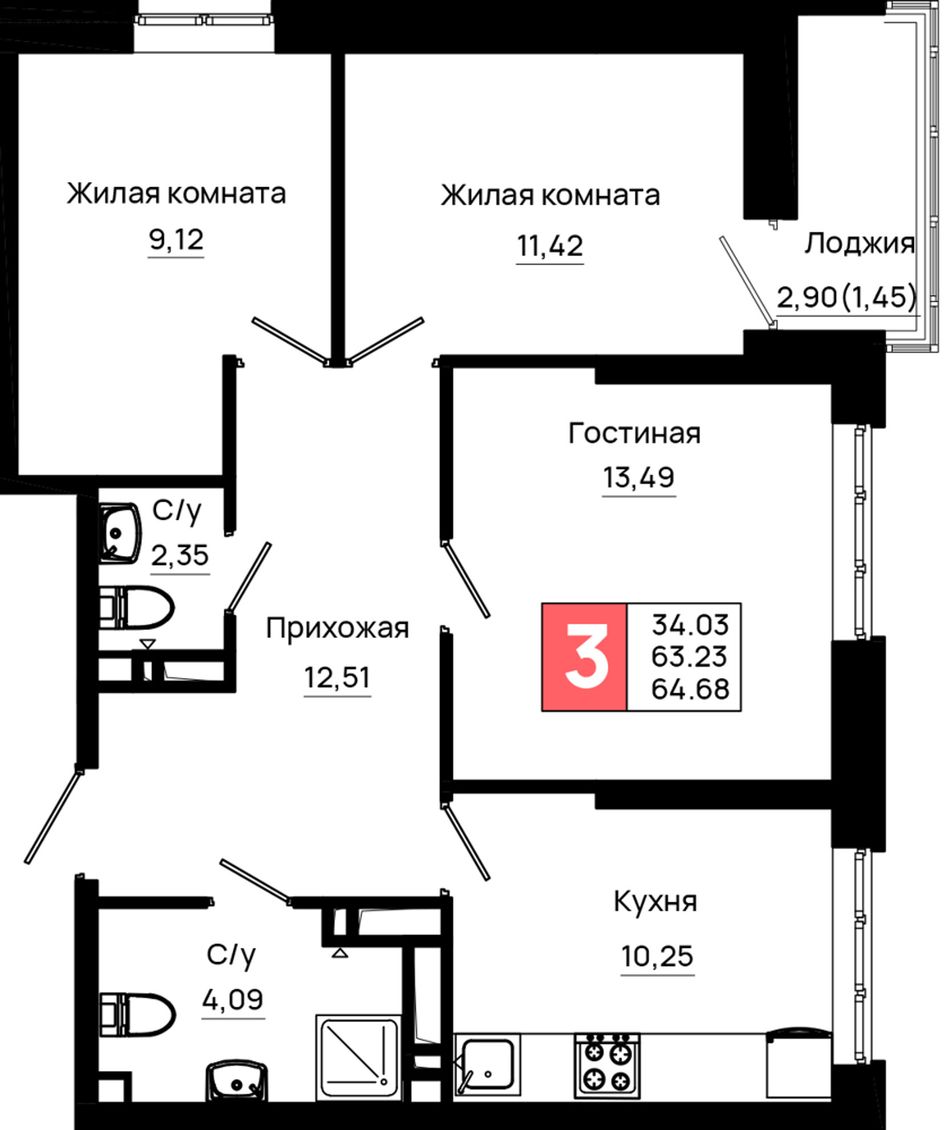 3-комнатная — 64,68 м² 20/25 эт. в Октябрь Парк