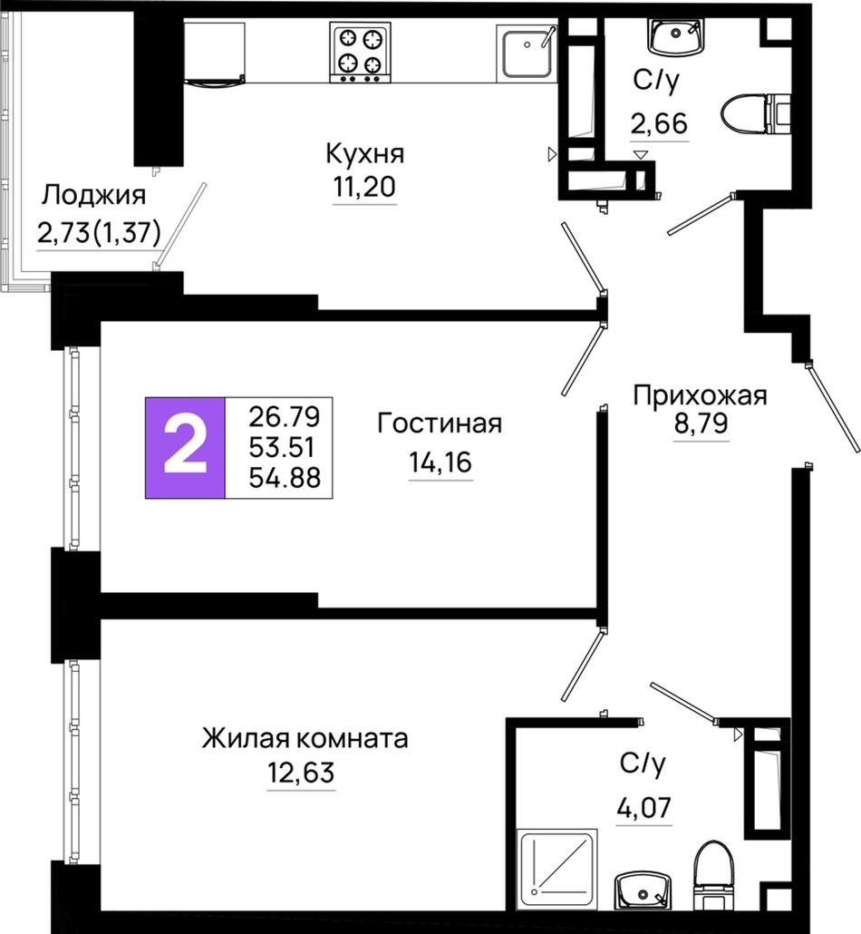 Общая площадь54,88 м²