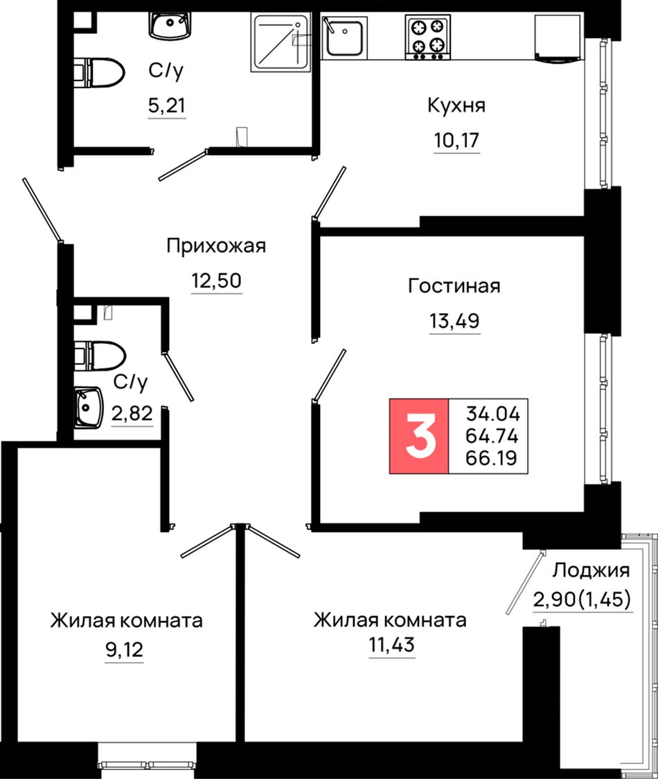 3-комнатная — 66,19 м² 2/25 эт. в Октябрь Парк