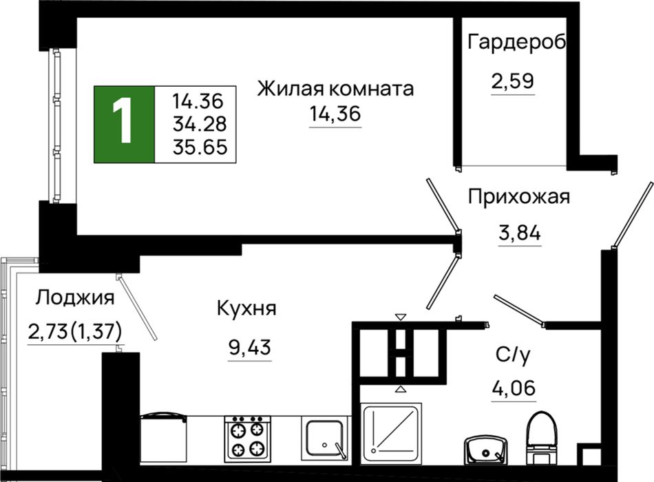 1-комнатная — 35,65 м² 18/25 эт. в Октябрь Парк