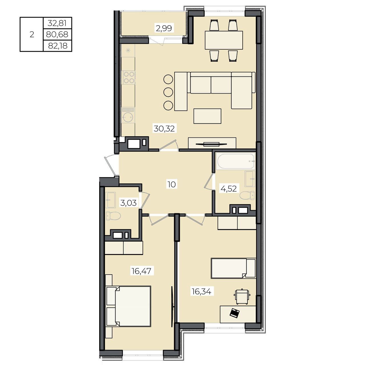 3-комнатная — 82,18 м² 8/12 эт. в Левобережный