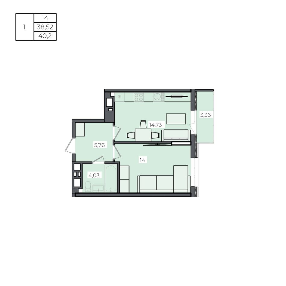 1-комнатная — 40,2 м² 1/15 эт. в Левобережный