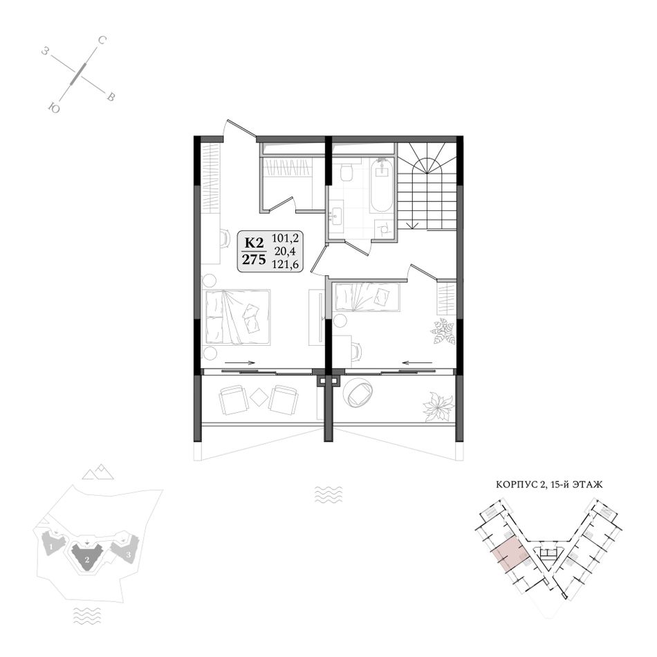В комплексе представлена широкая линейка планировочных решений от студий до двухуровневых пентхаусов на последних этажах.