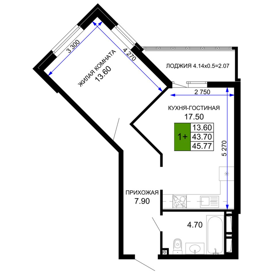 1-комнатная — 47,05 м² 3/12 эт. в Сегодня