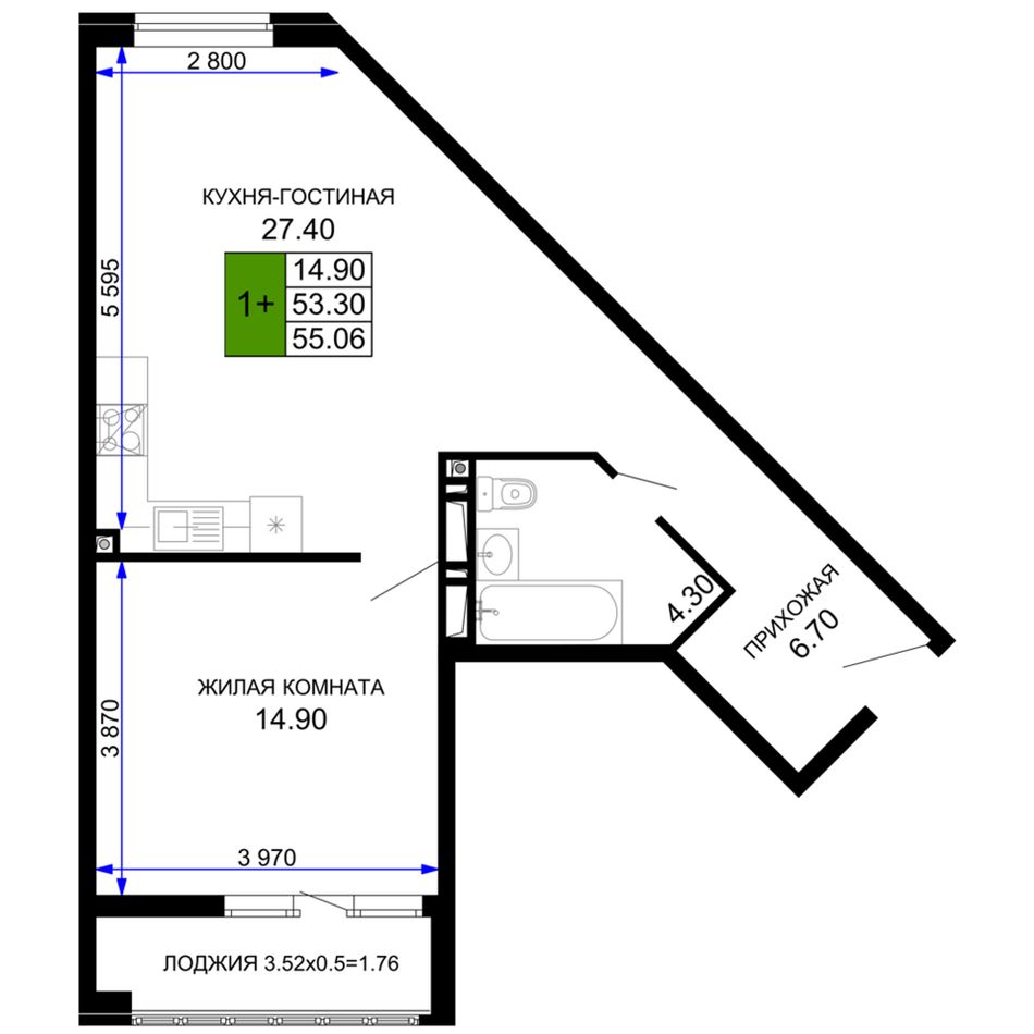 1-комнатная — 56,8 м² 5/12 эт. в Сегодня