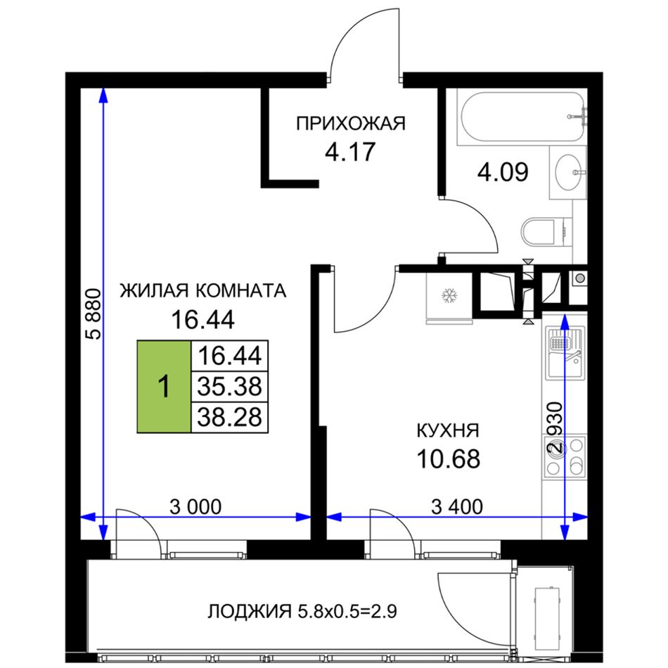 1-комнатная — 39,15 м² 6/16 эт. в Сегодня