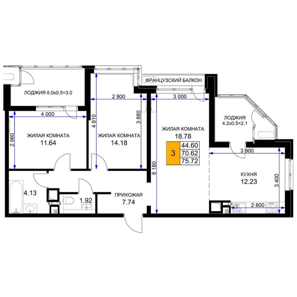 3-комнатная — 74,4 м² 14/16 эт. в Сегодня