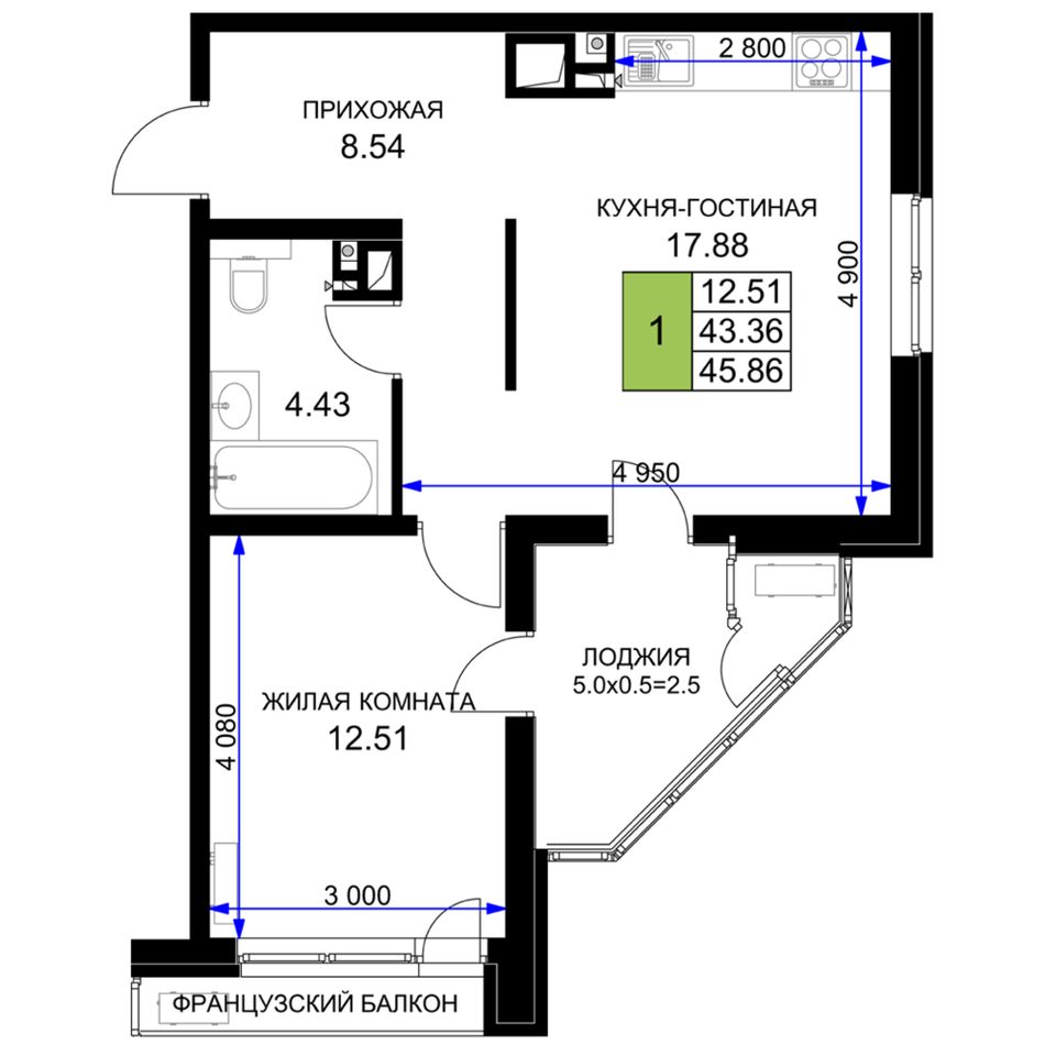 1-комнатная — 46,75 м² 15/16 эт. в Сегодня