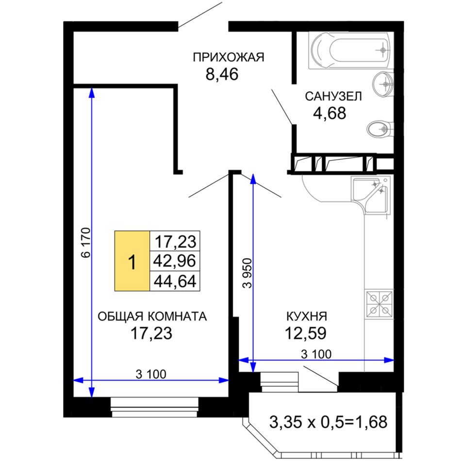1-комнатная — 43,75 м² 6/19 эт. в Лучший
