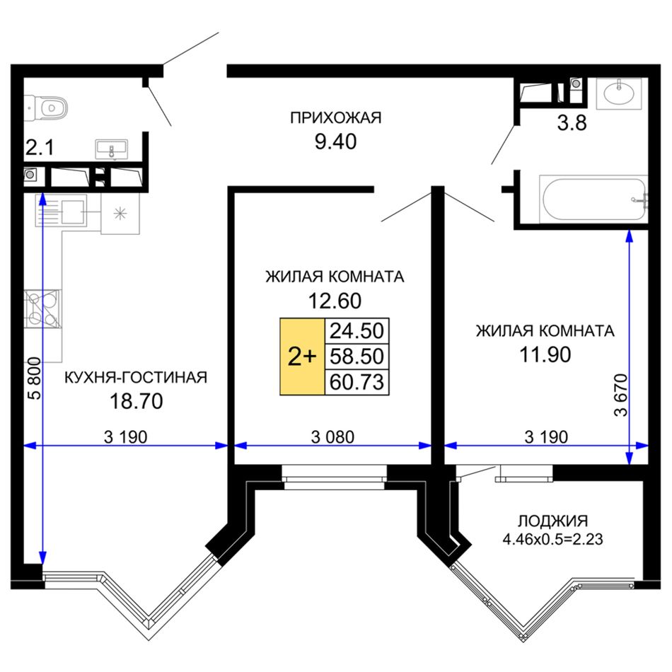 2-комнатная — 62,5 м² 9/12 эт. в Сегодня