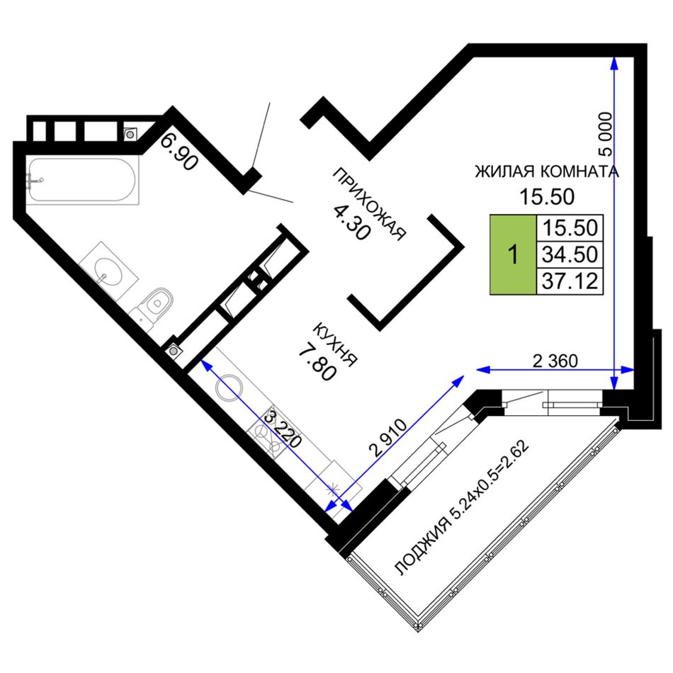 1-комнатная — 38,5 м² 6/12 эт. в Сегодня