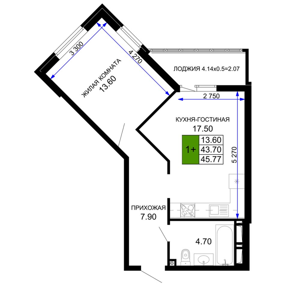1-комнатная — 47 м² 2/12 эт. в Сегодня